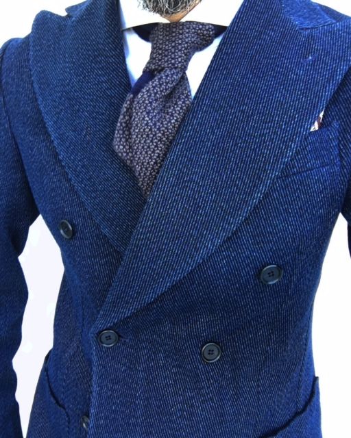 このピークドラペルからの緩やかな弧を描く曲線も、他の素材では目立たなくなってしまう箇所ですが、衿を立てる事によって、よりその繊細な仕事、技を目にする事が出来ます。