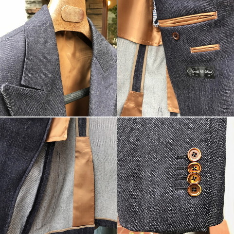 今回のお客様にお仕立て頂いたのが、ピークドラペルのシングルに、Ermenegildo ZegnaのTrofeo Denimを使った逸品。
